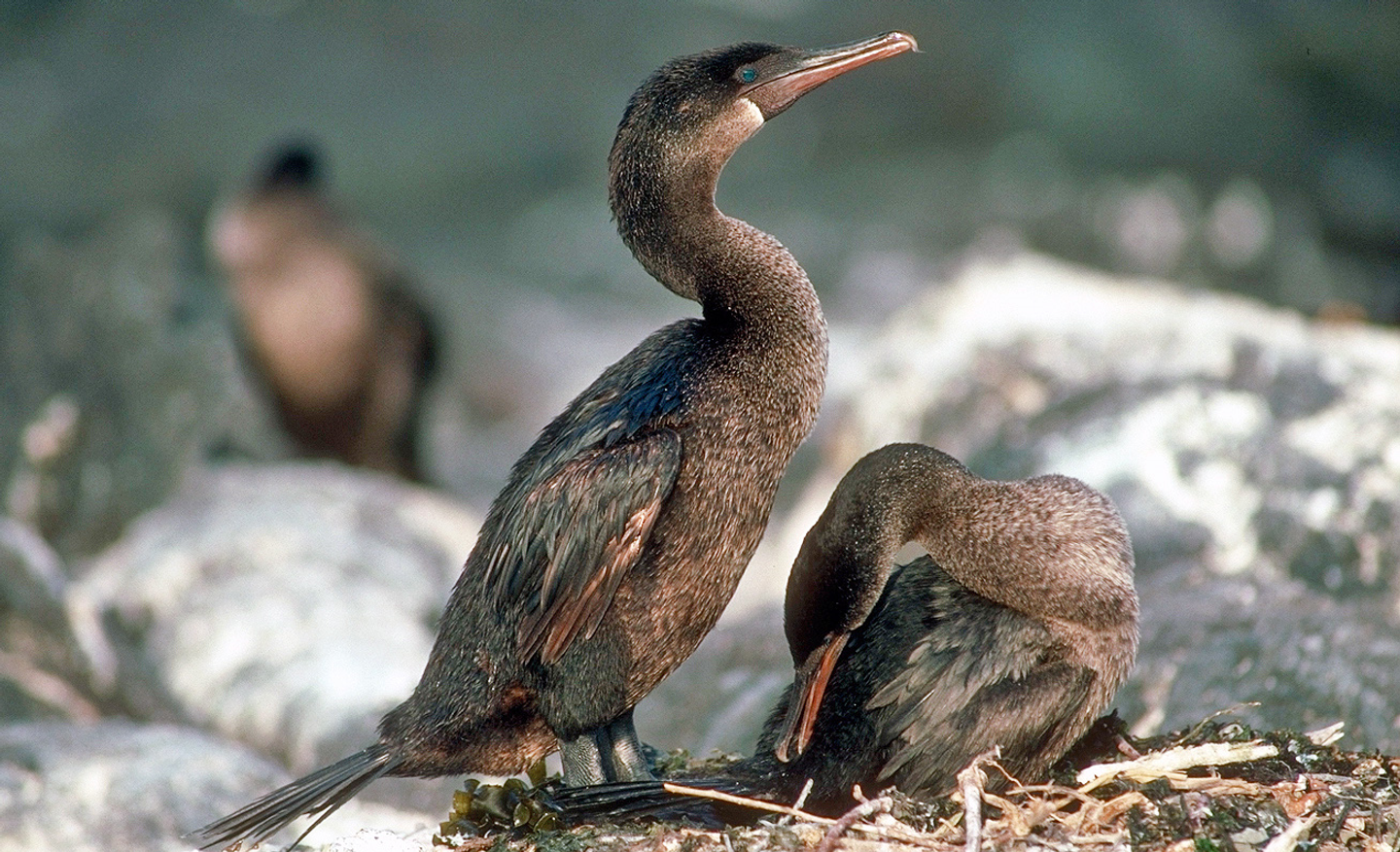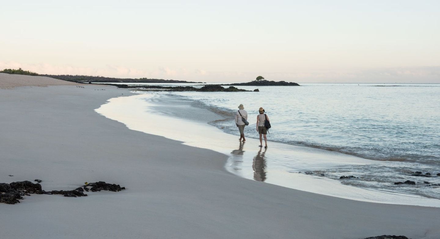 The wet landing is on the Green Beach of Punta Cormorant. If the light conditions are the correct ones, the sand shines green due to the high percentage of olivine crystals. On the easy walk through the Arid Zone, we come to a big saltwater lagoon with flamingos, white-cheeked pintail ducks, black-necked stilts, and, depending on the season, more migratory shorebirds. On a short walk, we find ourselves at the White Flour Sand Beach, named because of the fineness of the sand of white corals. It is a famous nesting beach for marine turtles. Often, we can see many stingrays in shallow water.