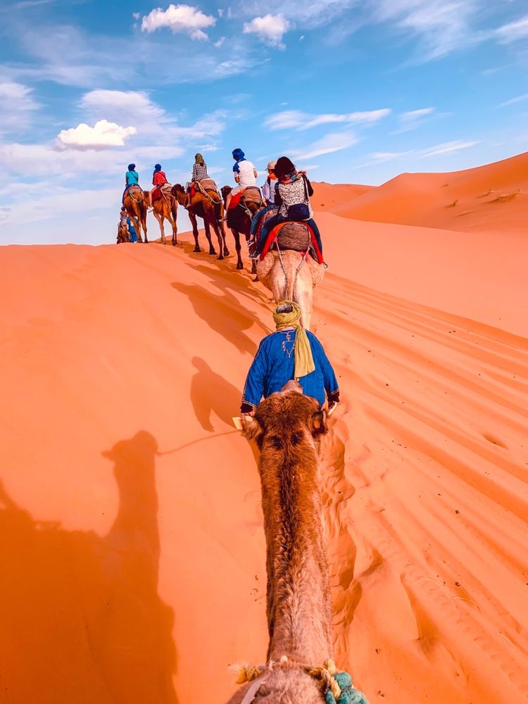 After breakfast, you will journey towards the Sahara Desert. You will arrive in Rissani which is also famous as a starting point of the ancient caravan roads crossing the Sahara desert. Mid afternoon, you will cross some rocky terrain all the way to Merzouga, where your camel caravan will be waiting for you. We will take a camel ride over Erg Chebbi dunes to watch an amazing sunset, before we return to our Sahara desert luxury camp. You will then enjoy dinner under the stars while being entertained by our local hosts.