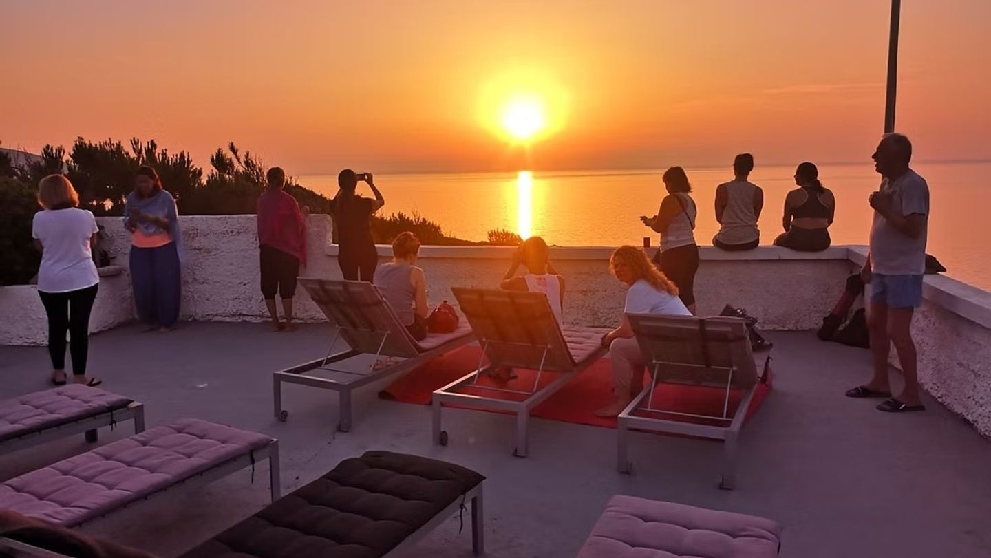 Guided meditation overlooking the blue Agean Sea.
