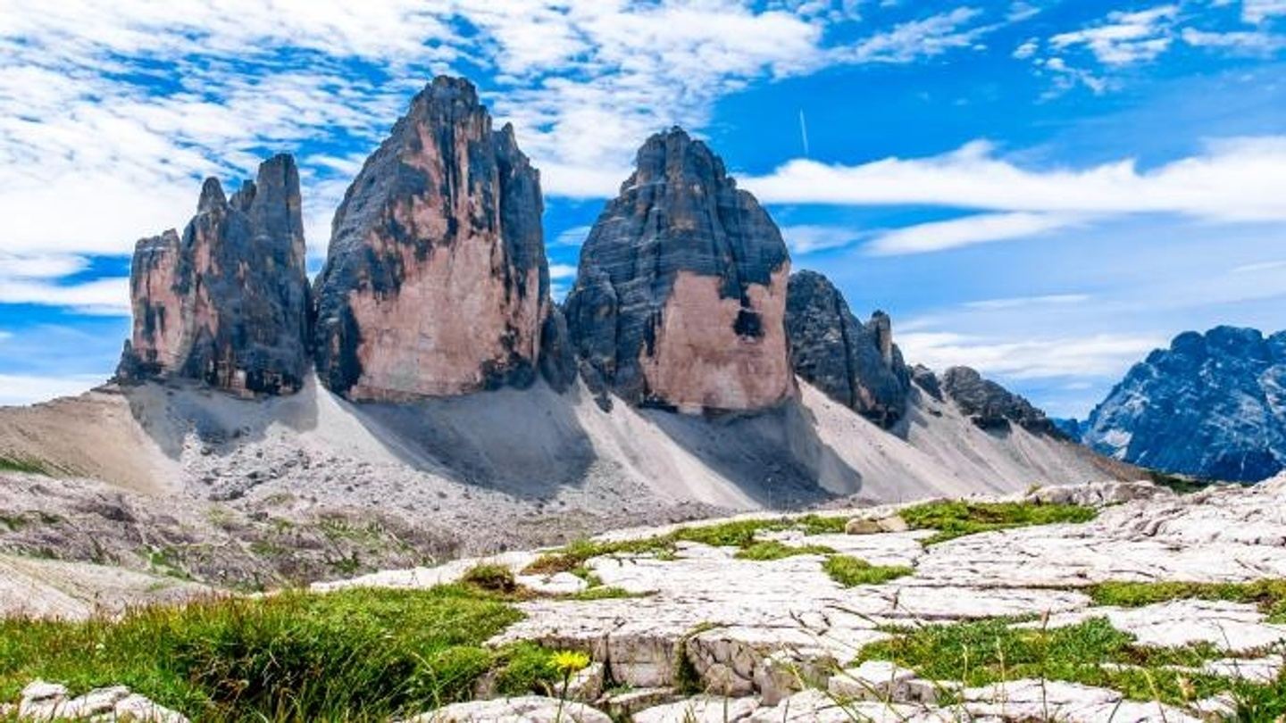 The three impressive peaks are called Cima Grande (2999 m/9,840 ft), Cima Occidentale (2973 m/9,754 ft), and Cima Piccola (2857 m/9,374 ft).
