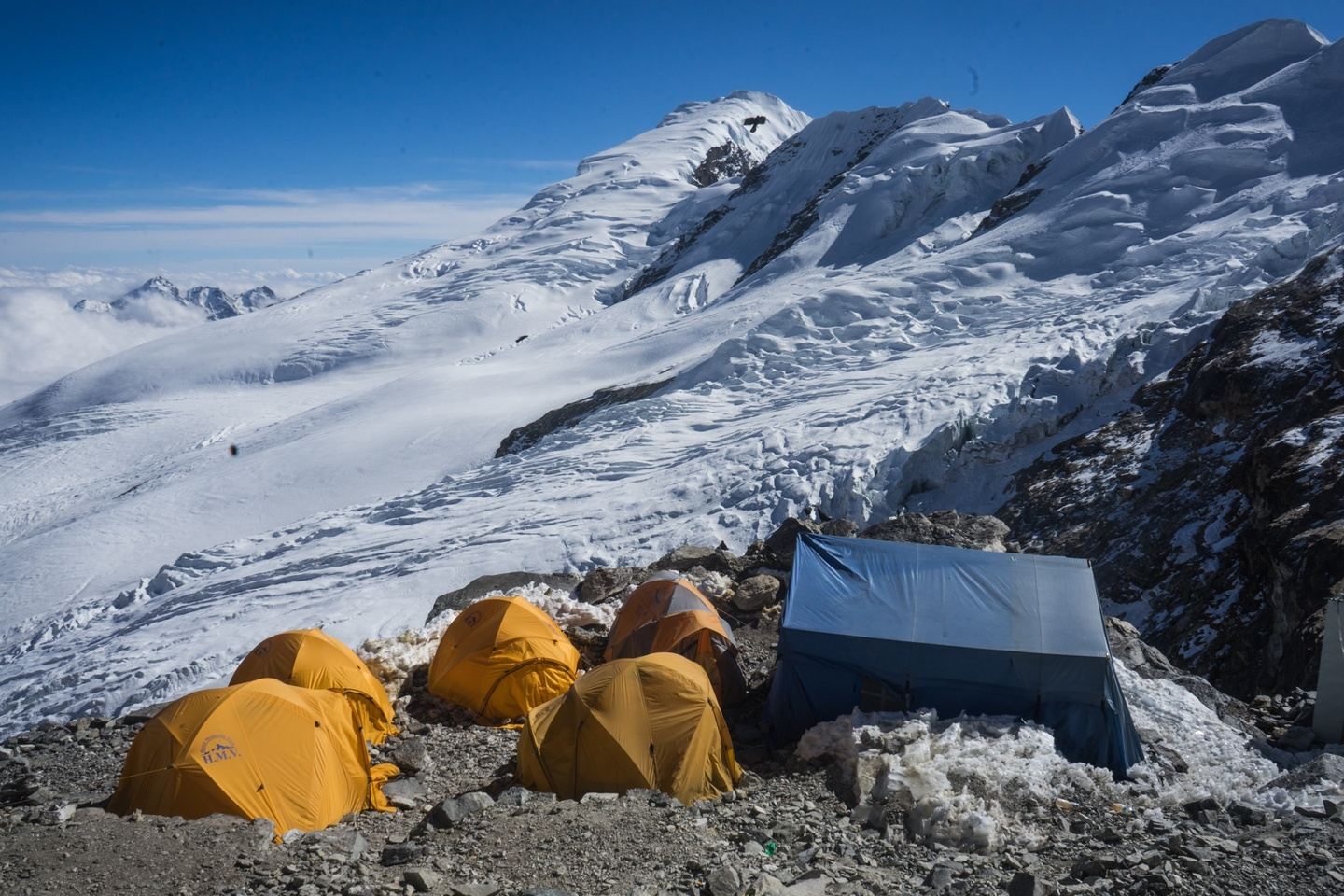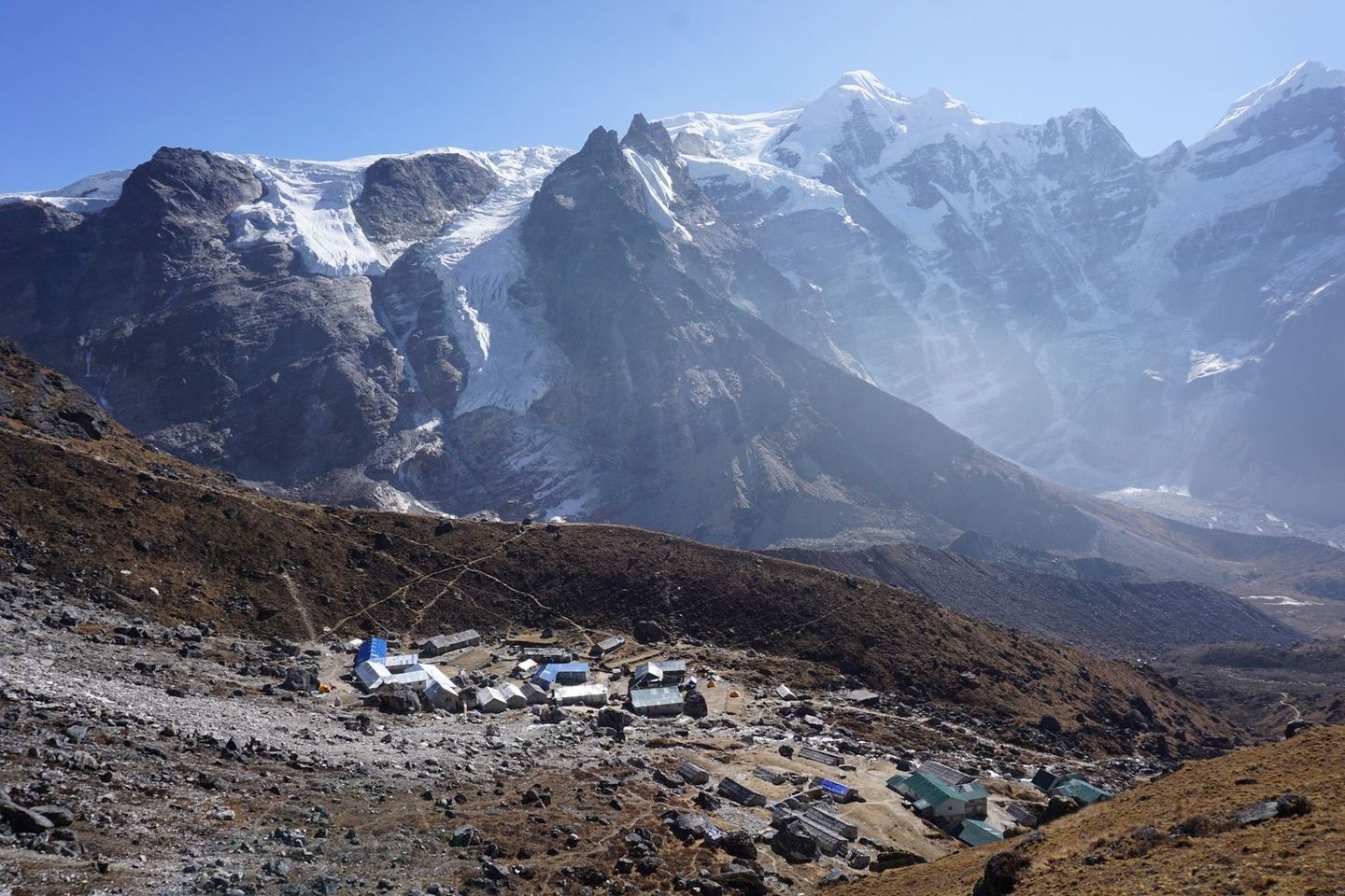 The slope steepens for a section behind the ridge and the summit comes into view. At the foot of the final steep summit, we may use a fixed rope if the climbing leader believes it’s required. The summit is only a few meters away and with some more effort, we finally reach the summit. From the summit, we take in spectacular views of the mighty Himalayas including Mt. Everest (8,848 m), Choyu (8,210 m), Lhotse (8,516 m), Makalu (8,463 m), Kangchenjunga (8,586 m), Nuptse (7,855 m), Chamlang (7,319 m), Baruntse (7,129 m) and others. Later, we return to the high camp where we rest for a while and start descending to Khare.