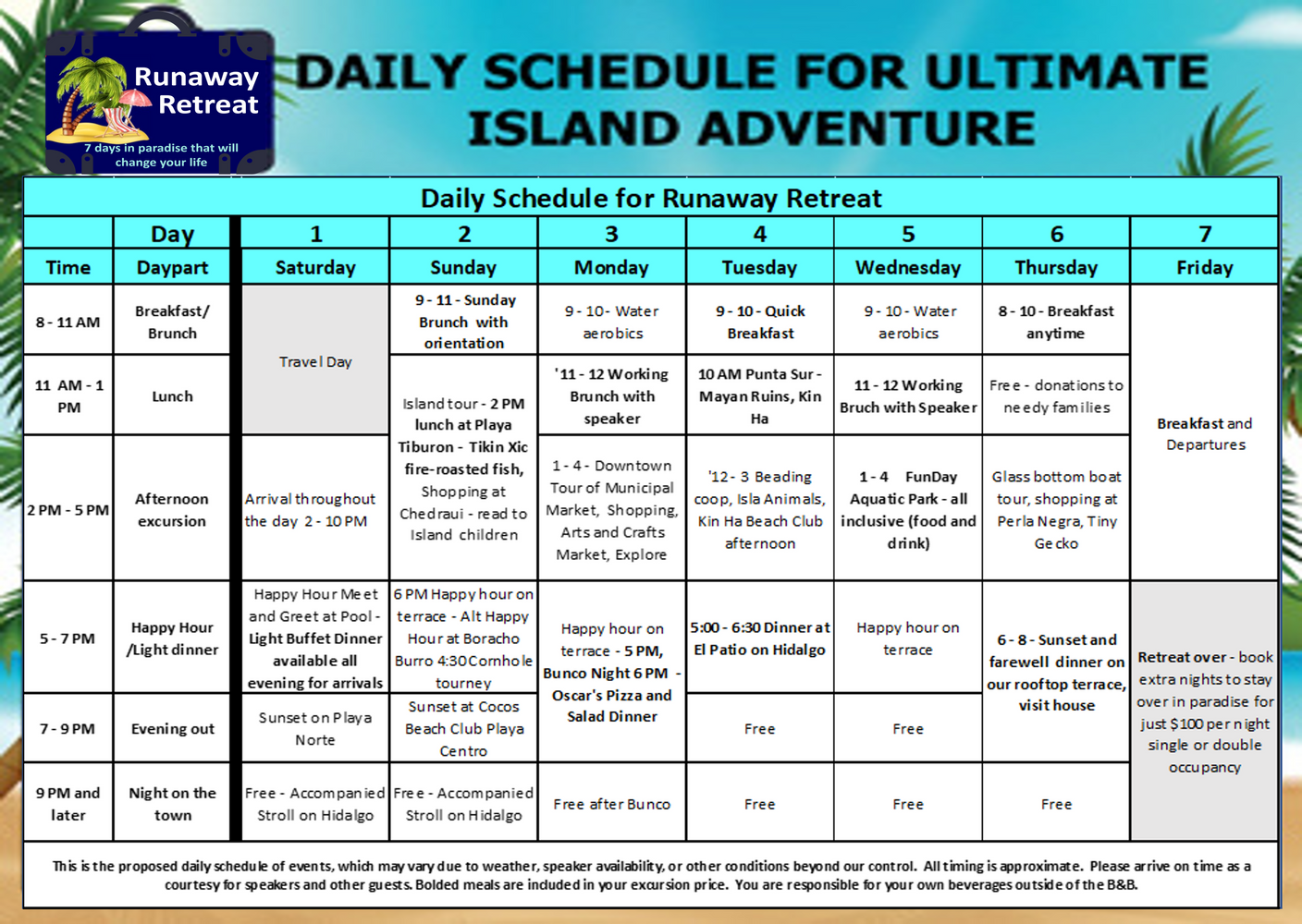Wear your swimsuit, as we will find places to take a dip along the way. You can choose to head back to the hotel, or join a group of Isla locals at DeNucios Italian restaurant overlooking the Caribbean, or across the street at El Borrocho Burro before heading back to the hotel. We will enjoy happy hour on the 3rd-floor terrace, before walking one block to Playa Norte, where you can swim at one of the 9 best beaches in the world while watching the sunset. Amazing! You can stay as long as you wish, then head back to the hotel, or stroll Hidalgo for a drink and music with us. You can grab a light dinner or snack on the beach or on Hidalgo - there are more than 212 restaurants on the tiny island, and each is better than the next one!