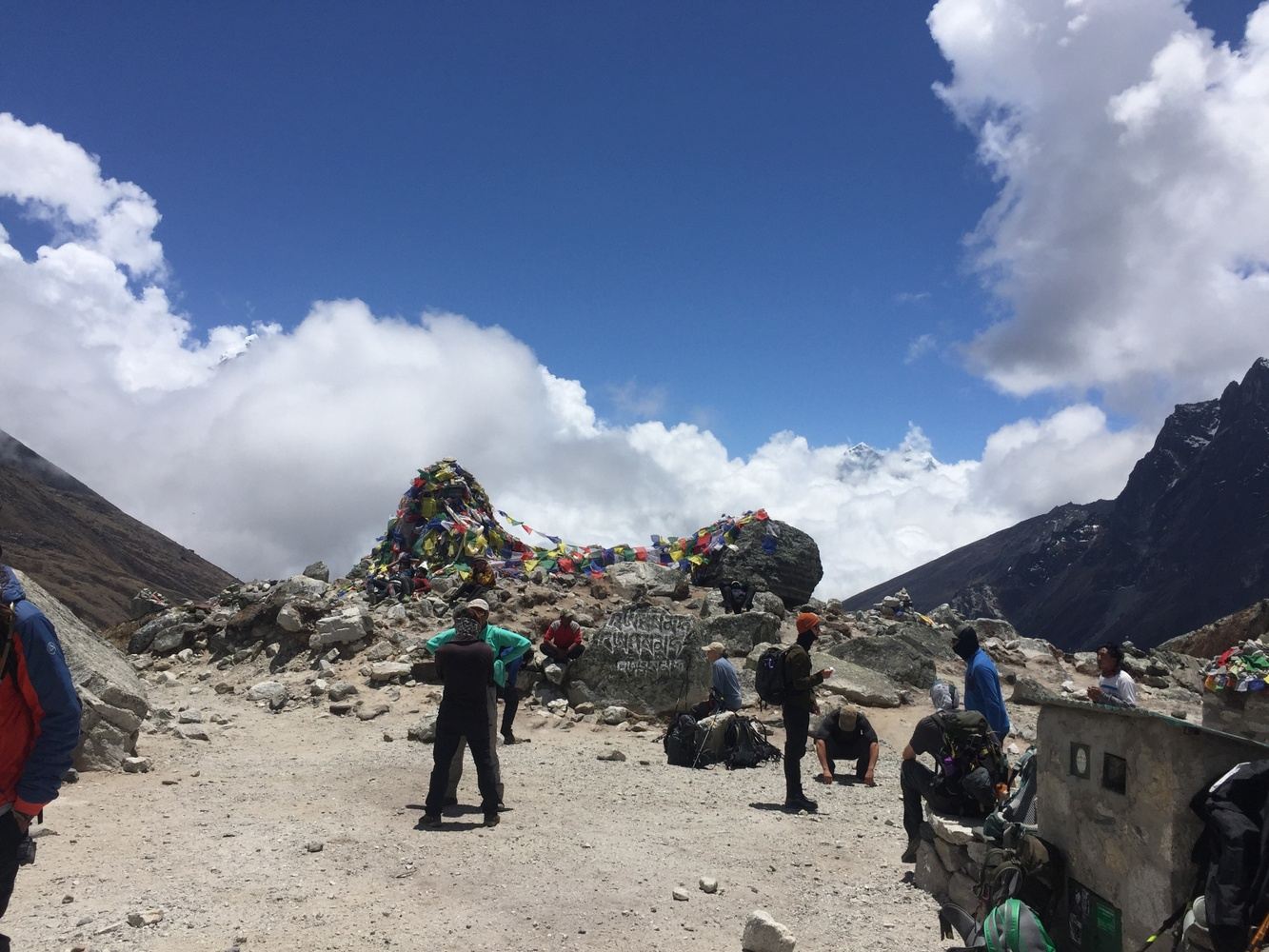 As walk heads down to a flat valley at Gorakshep, a small settlement with several lodges, located on route to the base camp and beneath the high hill of Kalapathar. A walk of few hours over a boulder of rocks and glaciated path to Everest base camp, on reaching at base camp stand beneath towering peaks of Nuptse and Lhotse, the views of Everest can be seen only the tip of the summit.