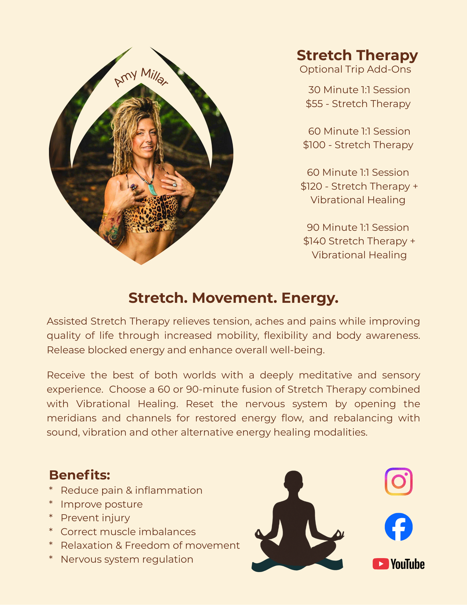 During the trip, Amy will be offering Stretch Therapy Sessions on a one-on-one basis. Please check this link for pricing and the different sessions being offered. You can book your session directly at time of booking. Please refer to the Add-Ons section below.